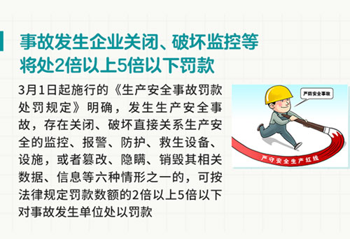 3月1日起施行的《生產(chǎn)安全事故罰款處罰規(guī)定》明確,發(fā)生生產(chǎn)安全事故,存在關(guān)閉、破壞直接關(guān)系生產(chǎn)安全的監(jiān)控、報(bào)警、防護(hù)、救生設(shè)備、設(shè)施,或者篡改、隱瞞、銷毀其相關(guān)數(shù)據(jù)、信息等六種情形之一的,可按法律規(guī)定罰款數(shù)額的2倍以上5倍以下對(duì)事故發(fā)生單位處以罰款...